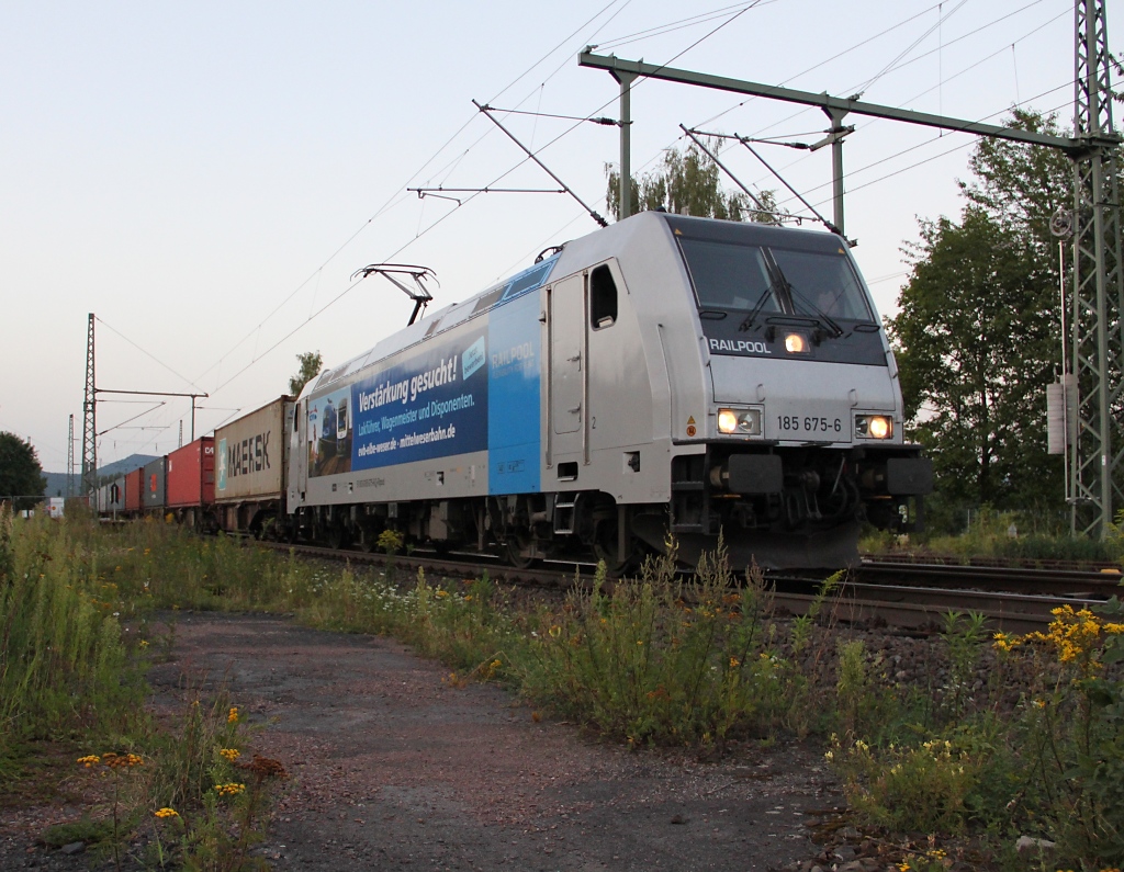 Je später der Abend... 185 675-6 fährt nach einem Signalhalt in Eschwege West weiter in Richtung Süden. Aufgenommen am 19.08.2012 am BÜ Eltmannshausen/Oberhone. Jens Baumhauer