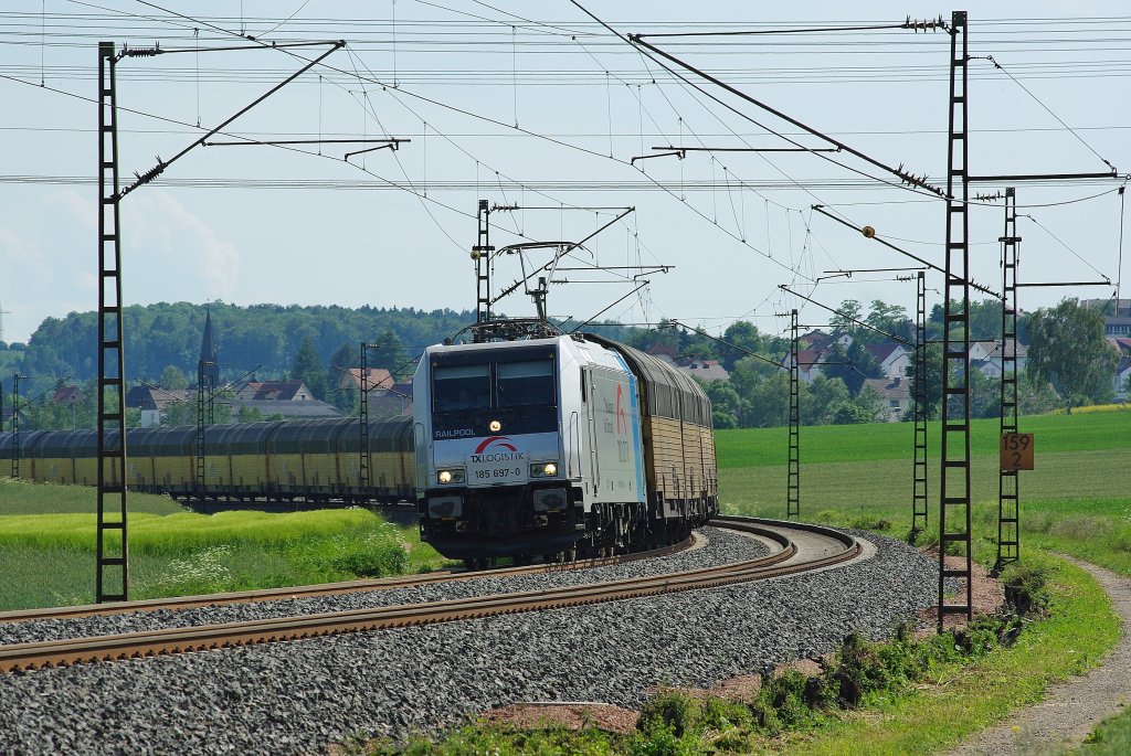 185 679-0 legt sich mit ihrem BMW-Zug bei Mecklar in Fahrtrichtung Bebra in die Kurve. Aufgenommen am 06.06.2010.