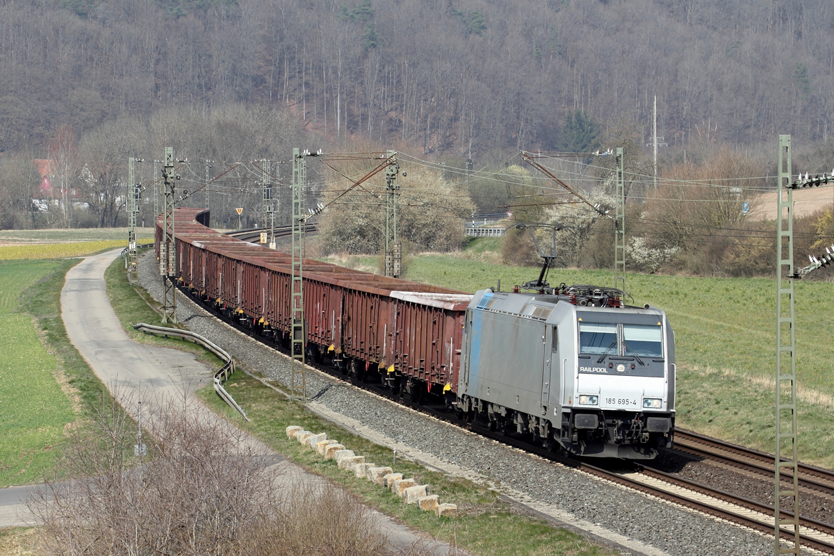 Die 185 695-4 von Railpool mit einem Güterzug vom Norden kommend durch Duisburg-Entenfang in Richtung Ratingen.