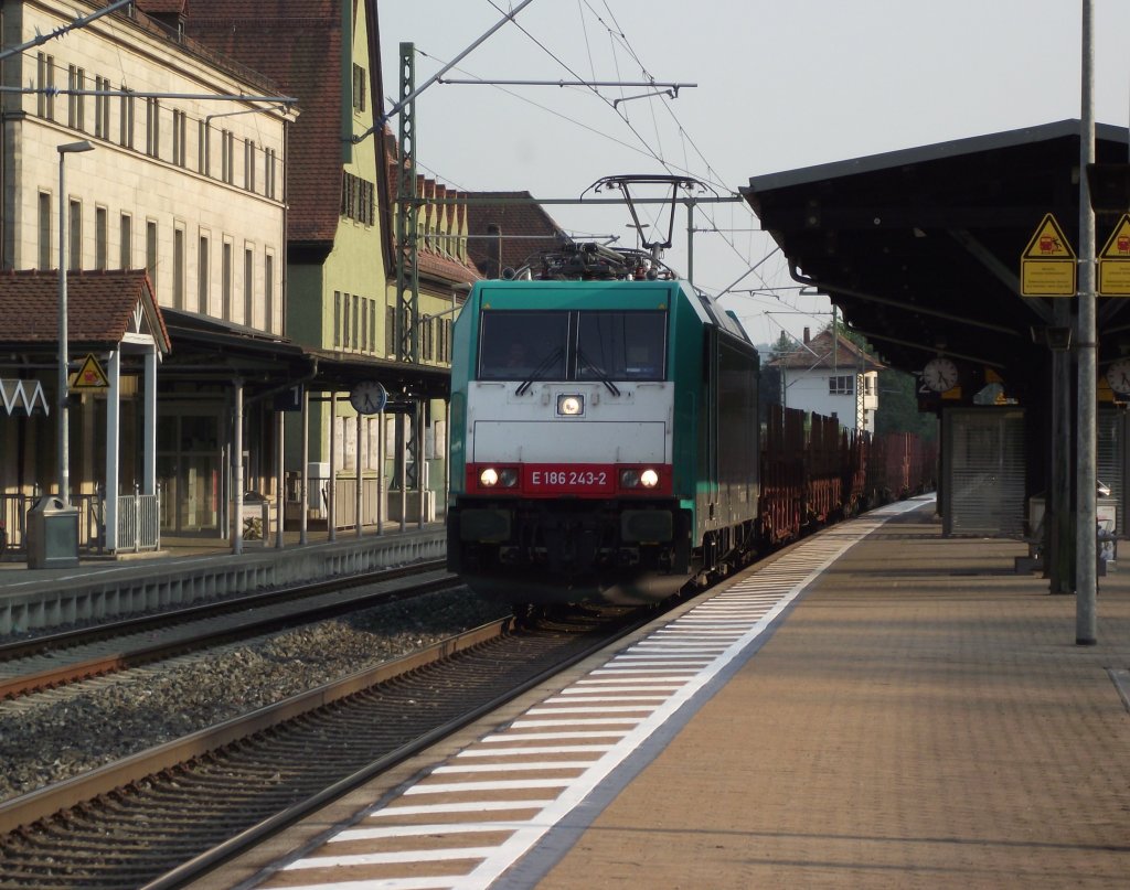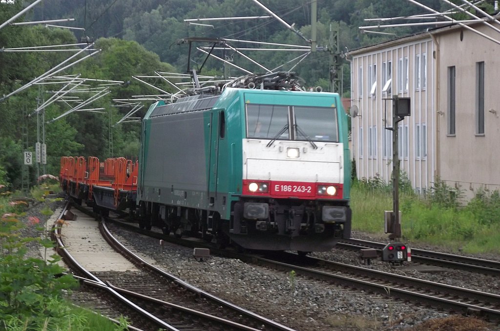 186 243-2 zieht am 12. Mai 2011 einen Schienenzug durch Kronach.