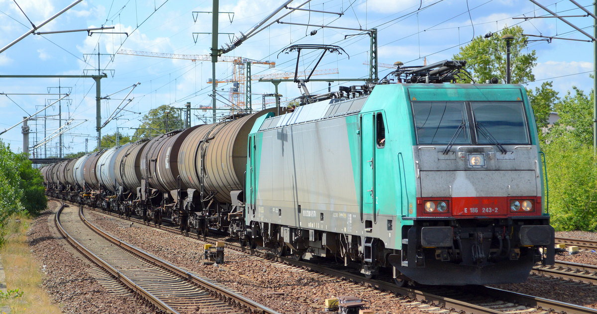 186 243-2 (91 51 5270 001-8 PL-TM) hat etliche Kessel- und Silowagen im Schlepp und rollt mit ihnen über die Leipziger Chaussee (B 6) in Halle (Saale) Richtung Abzweig Thüringer Bahn.