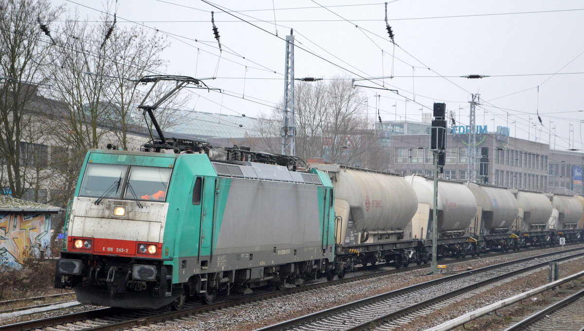 Transchem Sp. z o.o., Włocławek [PL] mit ihrer  E 186 243-2  [NVR-Nummer: 91 51 5270 001-8 PL-TM] und einem Kessel- u. Silowagenzug Richtung Frankfurt/Oder weiter nach Polen am 02.01.23 Berlin Hirschgarten.
