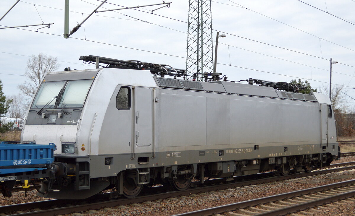 PKP CARGO S.A., Warszawa [PL] stand mit der angemieteten "186 265-5" [NVR-Nummer: 91 80 6186 265-5 D-AKIEM] und leeren Containertragwagen abgebügelt im Bf. Flughafen BER - Terminal 5 abgestellt am 24.02.22. Lothar Stöckmann