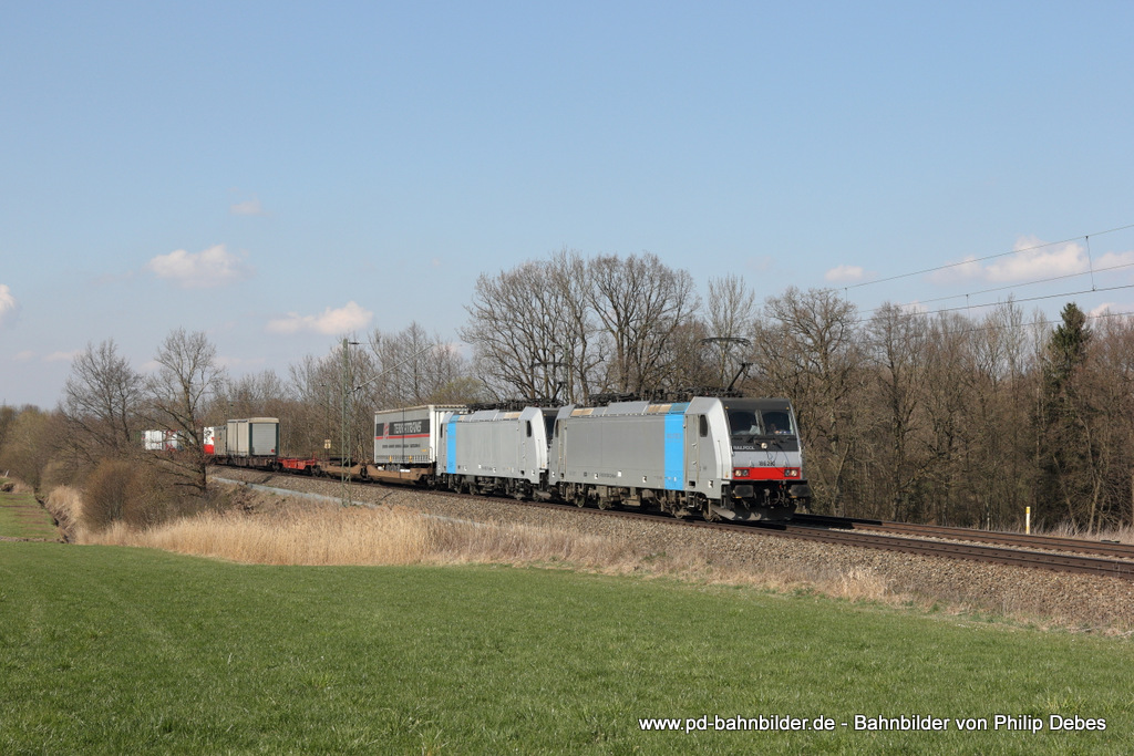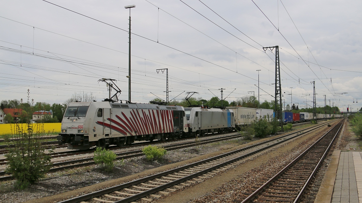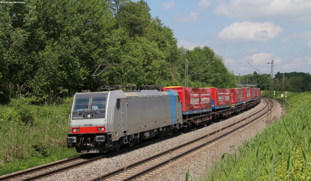 RAILPOOL 186 284-6 und RAILPOOL 186 290-3 gemietet von RTC, durchfahren am 5.5.2016 mit dem Intercombi / Samskip den Bahnhof Arnoldstein in Richtung Villach. Hans-Peter Kurz