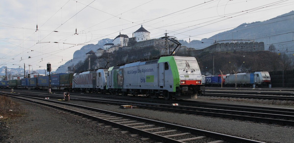 Die 486 502-8 der BLS, angemietet von Lomo und 186 285-3 mit einem Kombiverkehr bei der Ausfahrt am 7.1.2014 im Bahnhof Kufstein, Richtung Italien. Im Hintergrund stehen die 186 290-3 und die 482 045-2 der SBB Cargo, ebenfalls angemietet von Lomo. Grüße an den TF! Julien Seeling