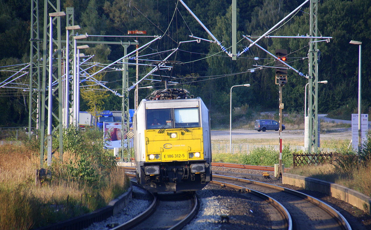 186 312-5 der Euro Cargo Rail kommt als Lokzug aus Köln-Kalk(D) nach Genk-Goederen(B) und kommt aus Richtung Mönchengladbach-Hbf,Rheydt-Hbf,Wickrath,Beckrath,Herrath,Erkelenz,Baal,Hückelhoven-Baal,Brachelen,Lindern,Süggerrath,Geilenkirchen,Frelenberg,Zweibrüggen,Übach-Palenberg,Rimburg,Finkenrath,Hofstadt und fährt durch Herzogenrath in Richtung Kohlscheid,Richterich,Laurensberg,Aachen-West. Aufgenommen vom Bahnsteig 1 in Herzogenrath. Am einem schönem Sommerabend vom 5.10.2016.