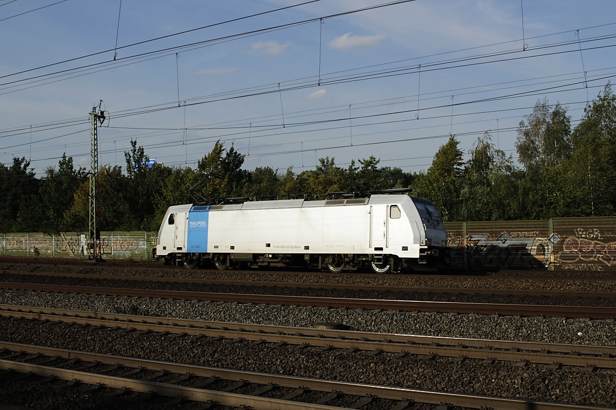 Kesselzug mit 186 433-9 Railpool, vermietet an die HSL Logistik GmbH (HSL), fährt in Halle (Saale), Karl-von-Thielen-Straße (Gebiet der DR), auf der Ostumfahrung für den Güterverkehr in nördlicher Richtung.