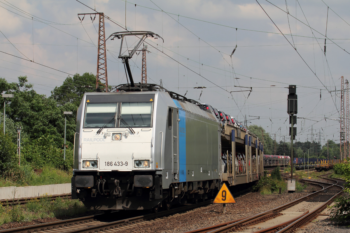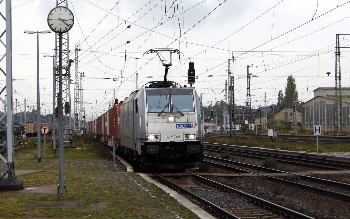 HSL Logistik GmbH mit der Rpool "186 433-9" [NVR-Number: 91 80 6186 433-9 D-Rpool] und einem schwach ausgelastetem KLV-ZUg (LKW WALTER Trailer) am 21.01.19 Bf. Berlin-Hohennschönhausen. Lothar Stöckmann