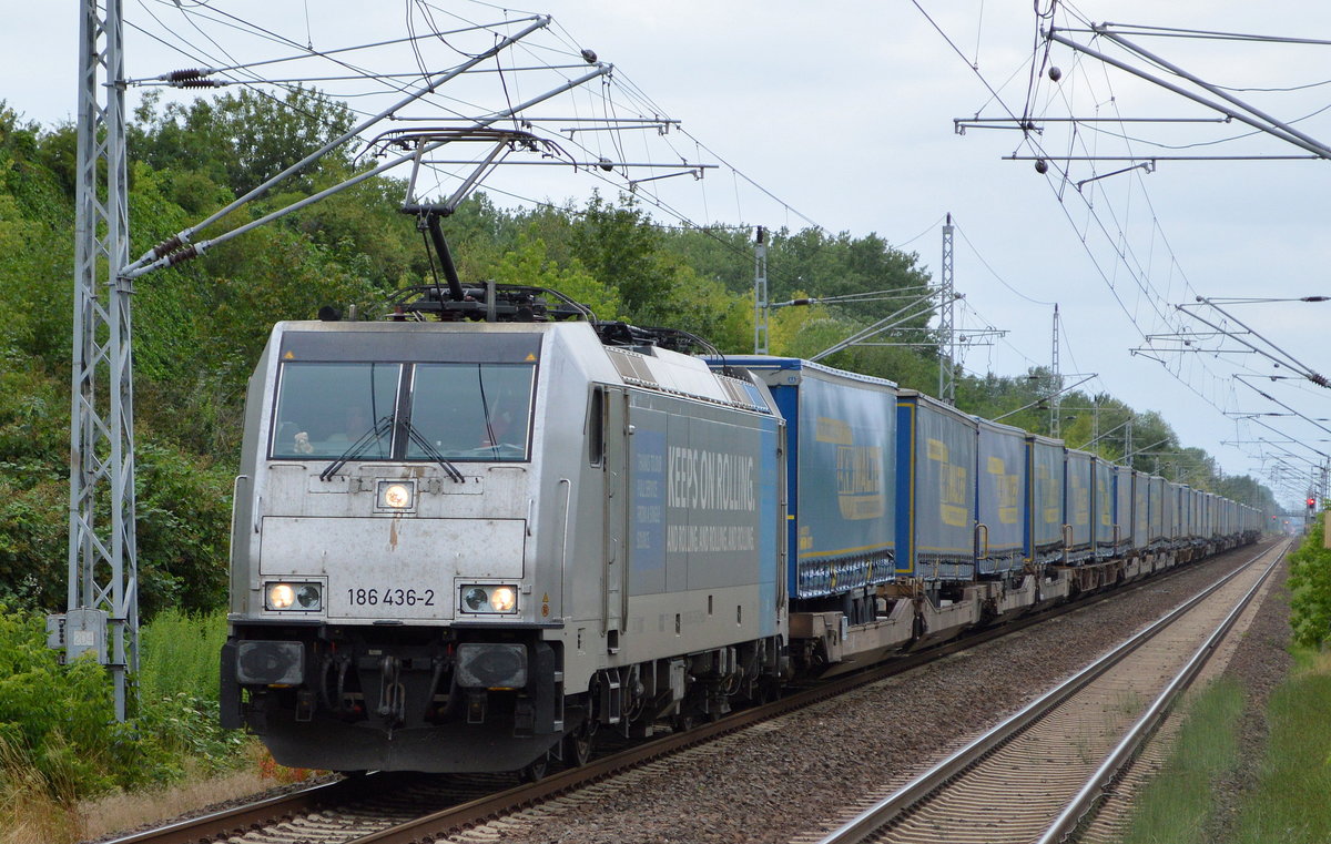 HSL Logistik GmbH mit Rpool "186 436-2" [NVR-Nummer: 91 80 6186 436-2 D-Rpool] und KLV-Zug (LKW Walter Trailer) am 15.07.19 Bahnhof Berlin-Hohenschönhausen. Viele Grüße an den Tf. !!! Lothar Stöckmann