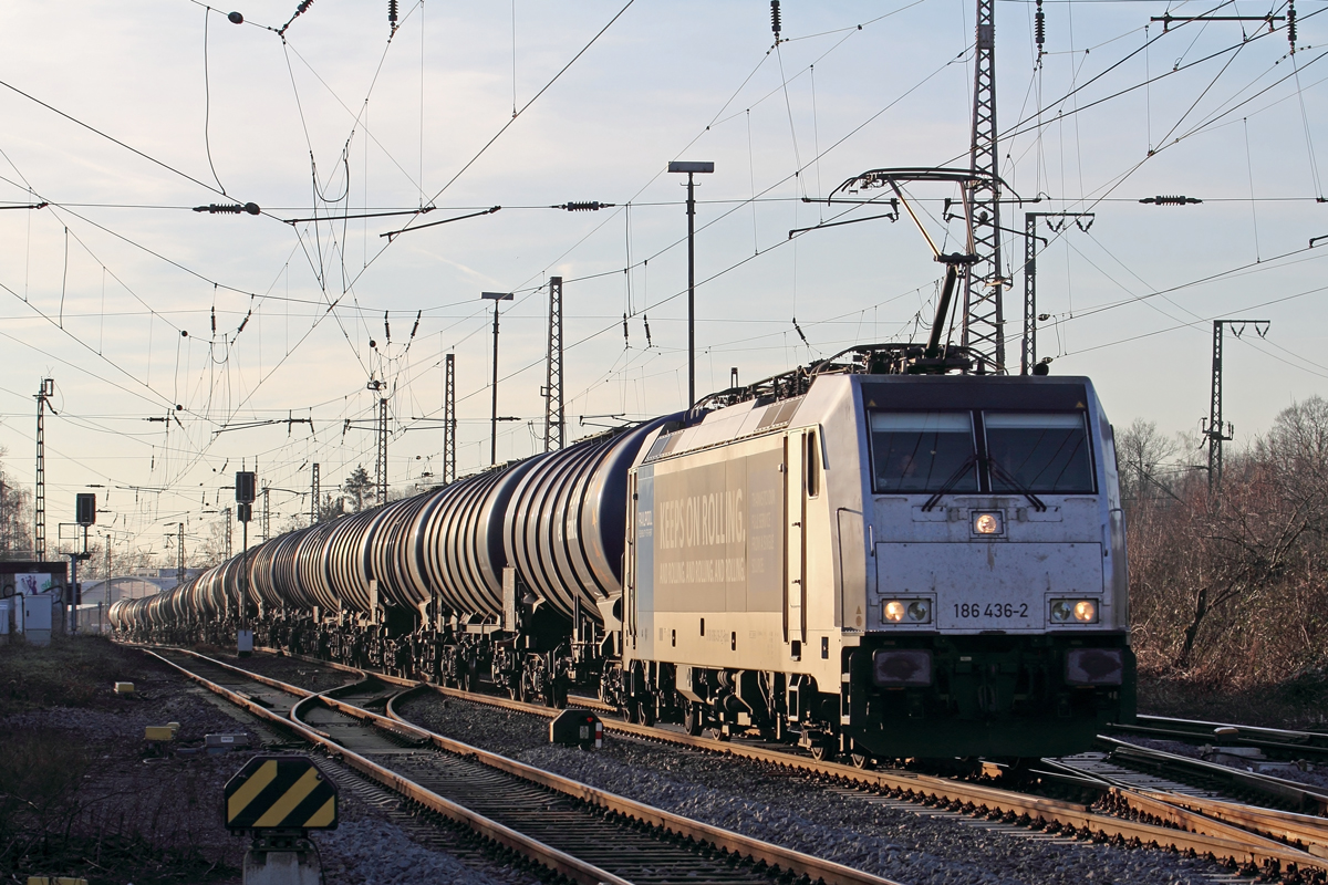 HSL Logistik GmbH mit der Rpool "186 436-2" [NVR-Number: 91 80 6186 436-2 D-Rpool] "KEEPS ON ROLLING." und er rollt und rollt und rollt am 28.01.18 Bf. Flughafen Berlin-Schönefeld. Lothar Stöckmann