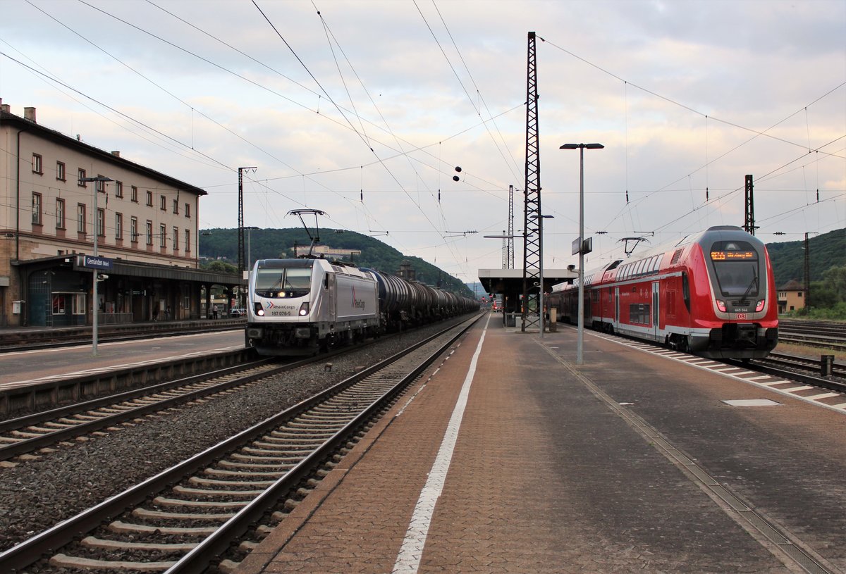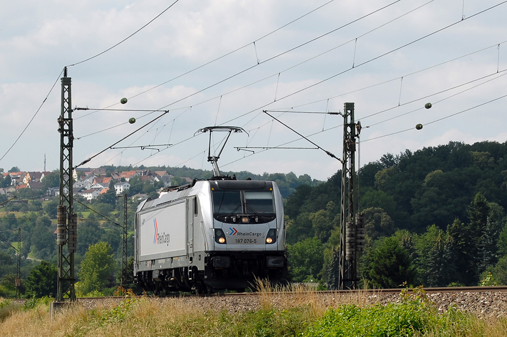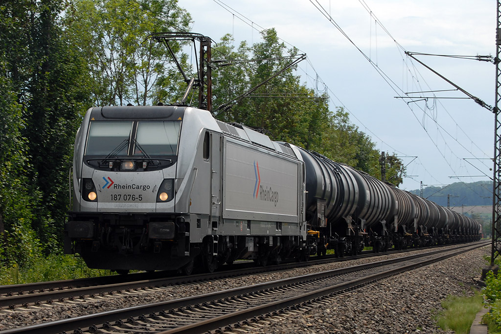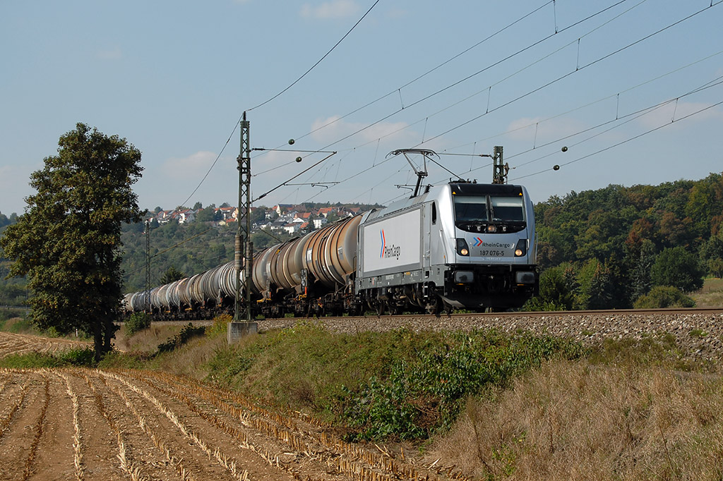 Mit einer 185ziger kalt als Wagenlok und einigen Kesseln am Haken ist 187 076-5 bei Thüngersheim am 7.10.2022 gen Würzburg fahrend abgelichtet worden. Andreas Strobel