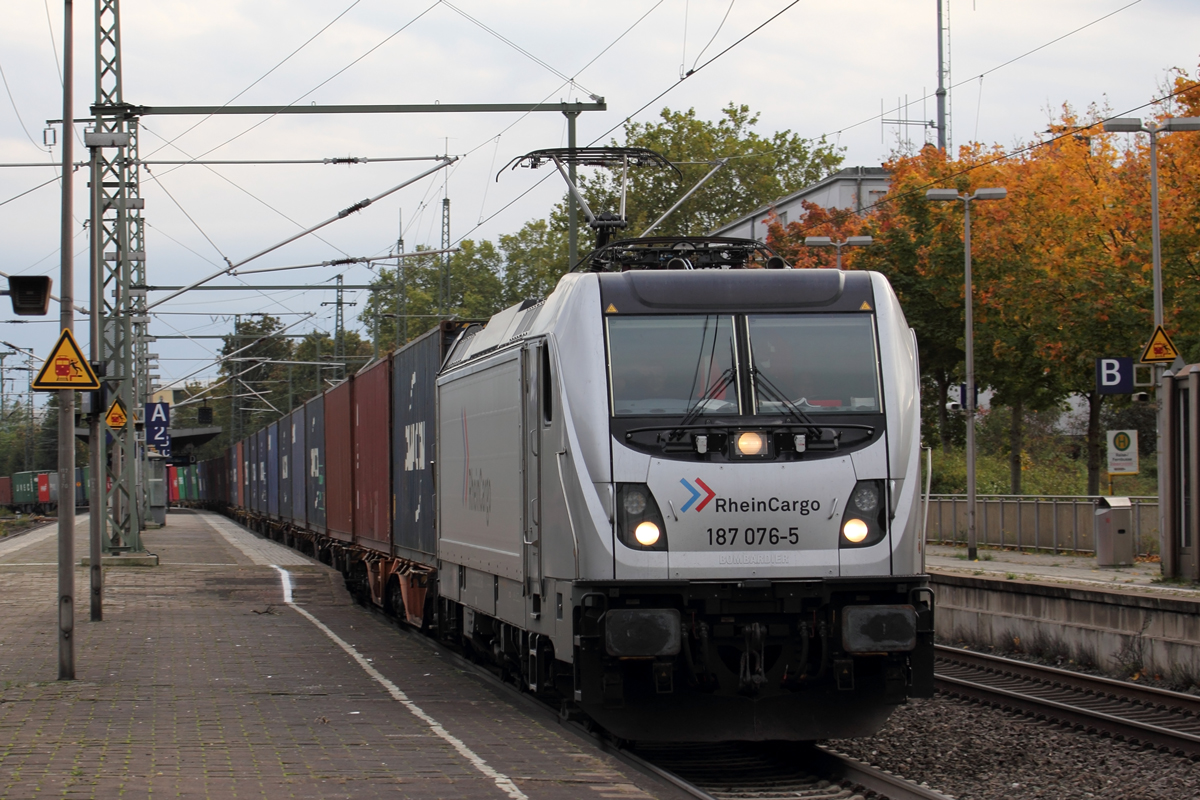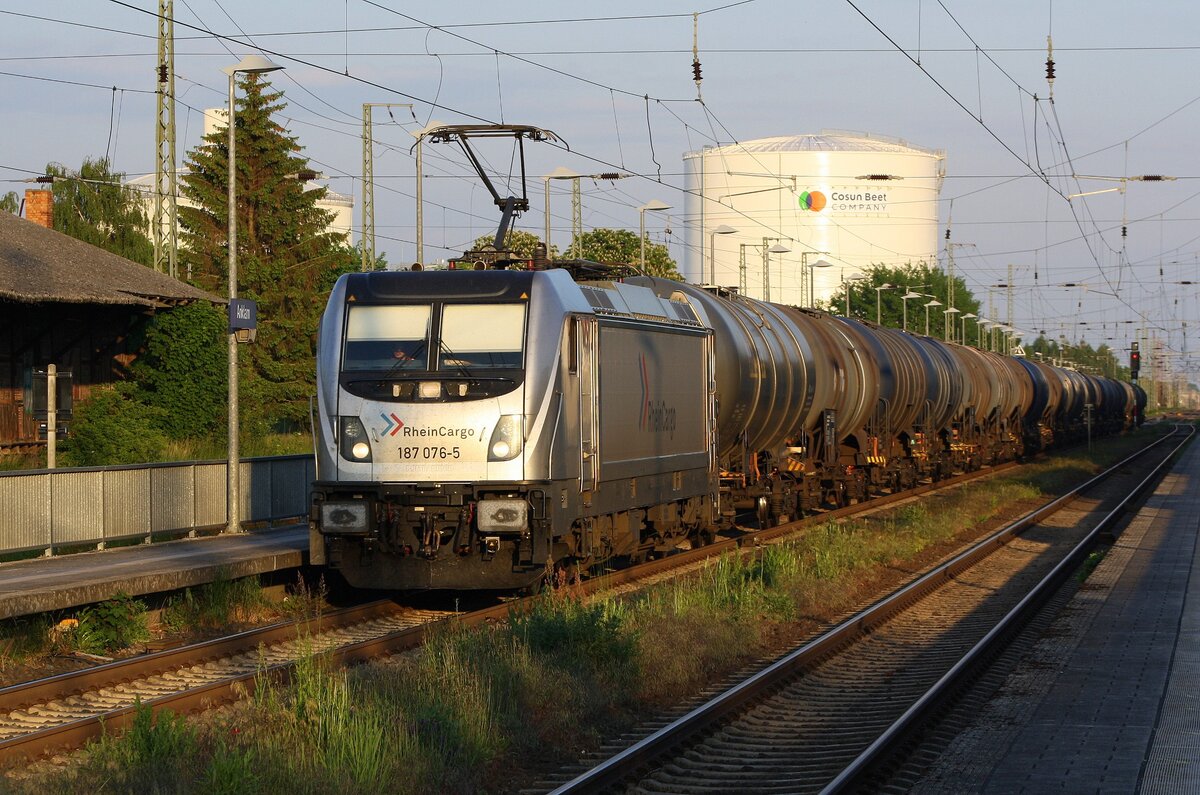 RheinCargo GmbH & Co. KG, Neuss [D] mit "187 076-5" [NVR-Nummer: 91 80 6187 076-5 D-RHC] und Kesselwagenzug mit Benzin am 30.09.19 Durchfahrt Bahnhof Flughafen Berlin Schönefeld. Lothar Stöckmann