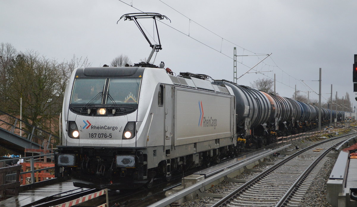 RheinCargo GmbH & Co. KG, Neuss [D] mit ihrer "187 076-5" [NVR-Nummer: 91 80 6187 076-5 D-RHC] und einem Kesselwagenzug am 30.07.24 Höhe Bahnhof Hamburg Harburg. Lothar Stöckmann