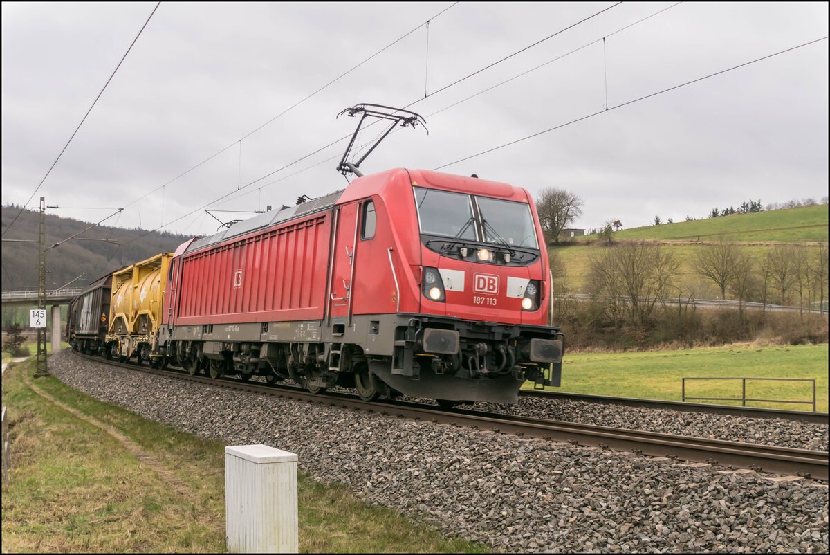 187 113-6 mit einem gemiscchten Güterzug am 09.02.2022 bei Hermannspiegel unterwegs.