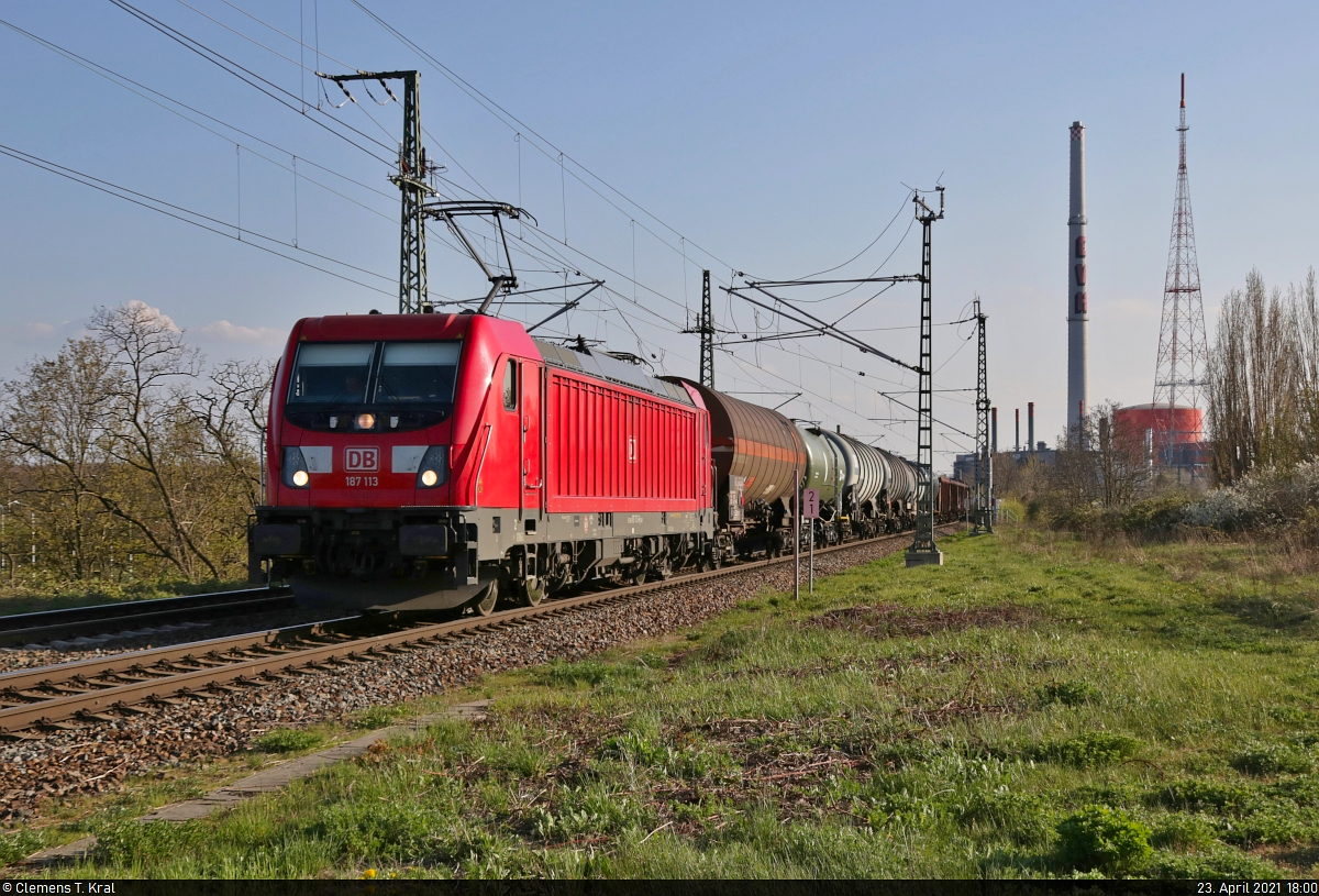 Gemischter Gz mit 187 113-6 unterwegs auf dem Gegengleis an der Leipziger Chaussee (B 6) in Halle (Saale) in nördlicher Richtung. 🧰 DB Cargo 🕓 23.4.2021 | 18:00 Uhr