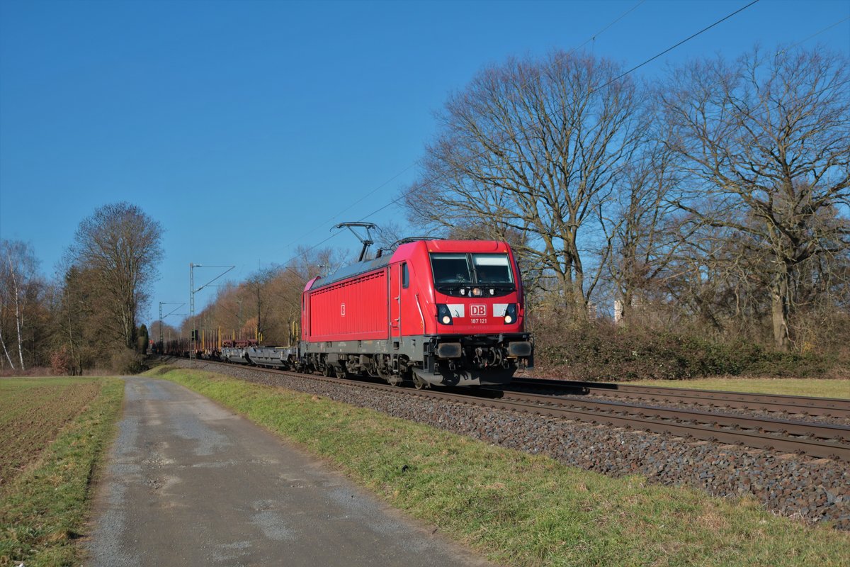 Doppelte Traxx-3-Power: 187 121-9 und 187 082-3 bespannen einen EZ zur Zugbildungsanlage (ZBA) Halle (Saale) und haben es auf Höhe der Leipziger Chaussee (B 6) nicht mehr weit.