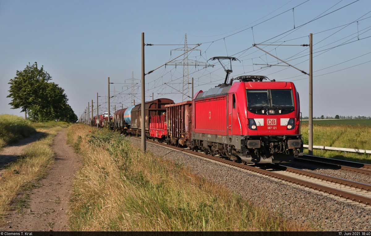 Gemischter Gz mit 187 121-9 unterwegs in Braschwitz Richtung Halle (Saale).