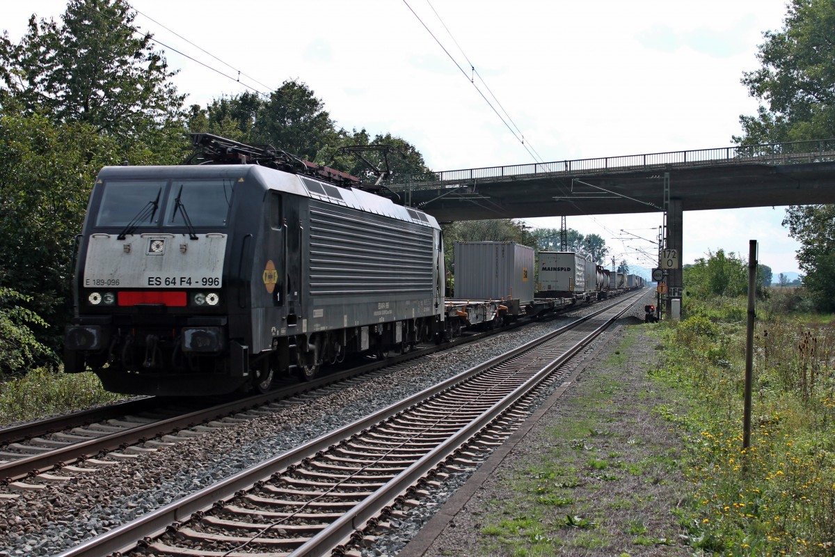 Durchfahrt am 25.09.2014 der MRCE/SBB Cargo Internationl/RRF - Rotterdam Rail Feeding B.V.  ex. HUSA  ES 64 F4-996 (189 096-1) mit einem Containerzug in Orschweier gen Norden. Ich nehme mal an, dass sie zu diesem Zeitpunkt für SBB Cargo International fuhr, da RRF keine Leistung in Richtung Basel hat.