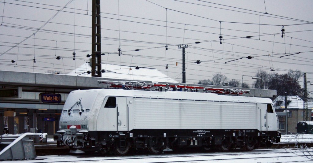 Abgestellt in Wels war am 03.12.10 die 189 841-0. das Foto entstand vom gegenüberliegenden Parkplatz.