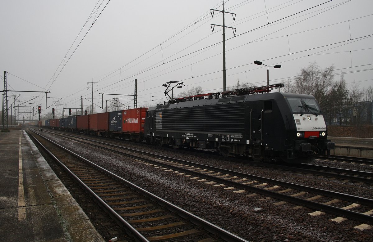 189 841-0 passiert mit einem Containerzug den Bahnhof Berlin Schönefeld Flughafen in östlicher Richtung. (17.12.2016)