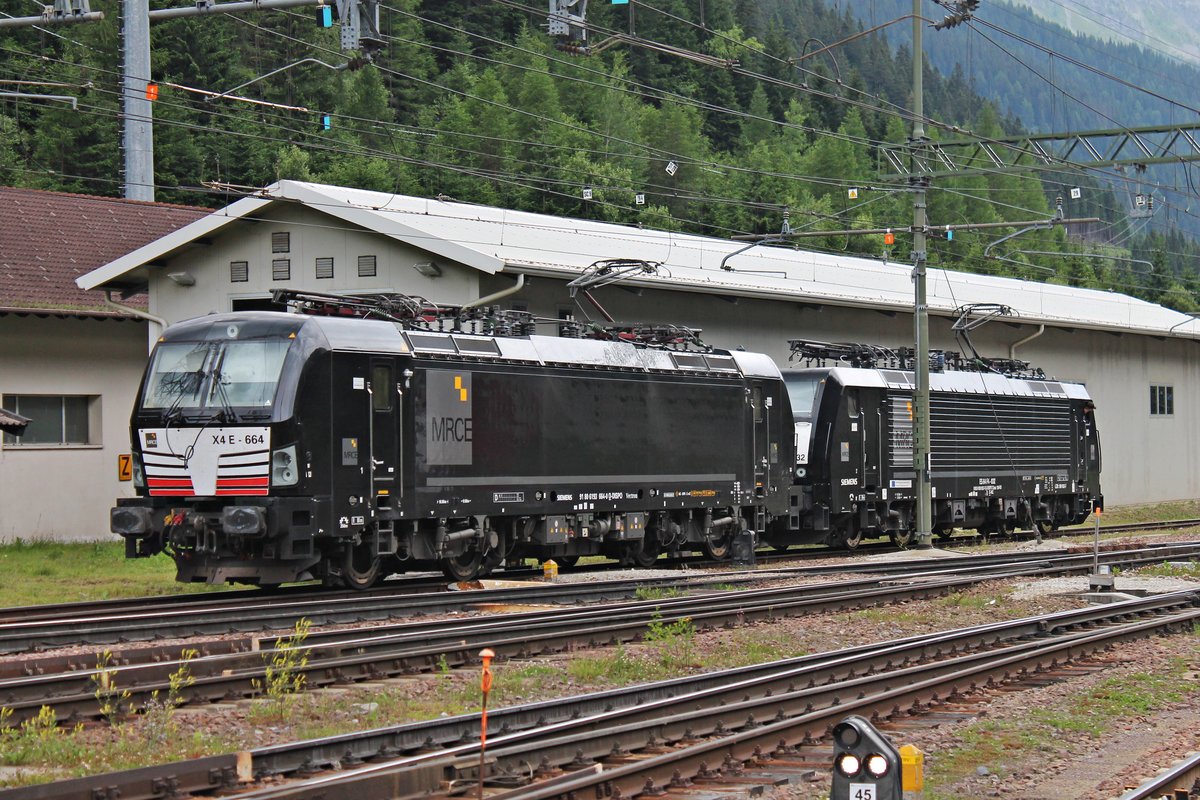 Nachschuss auf MRCE/LM X4 E-664 (193 664-0), als diese am Nachmittag des 05.07.2018 zusammen mit MRCE/LM ES 64 F4-032 (189 932-7) durchs südliche Vorfeld vom Bahnhof in Brennero rangierte um wieder zurück nach Österreich zu kommen. Tobias Schmidt