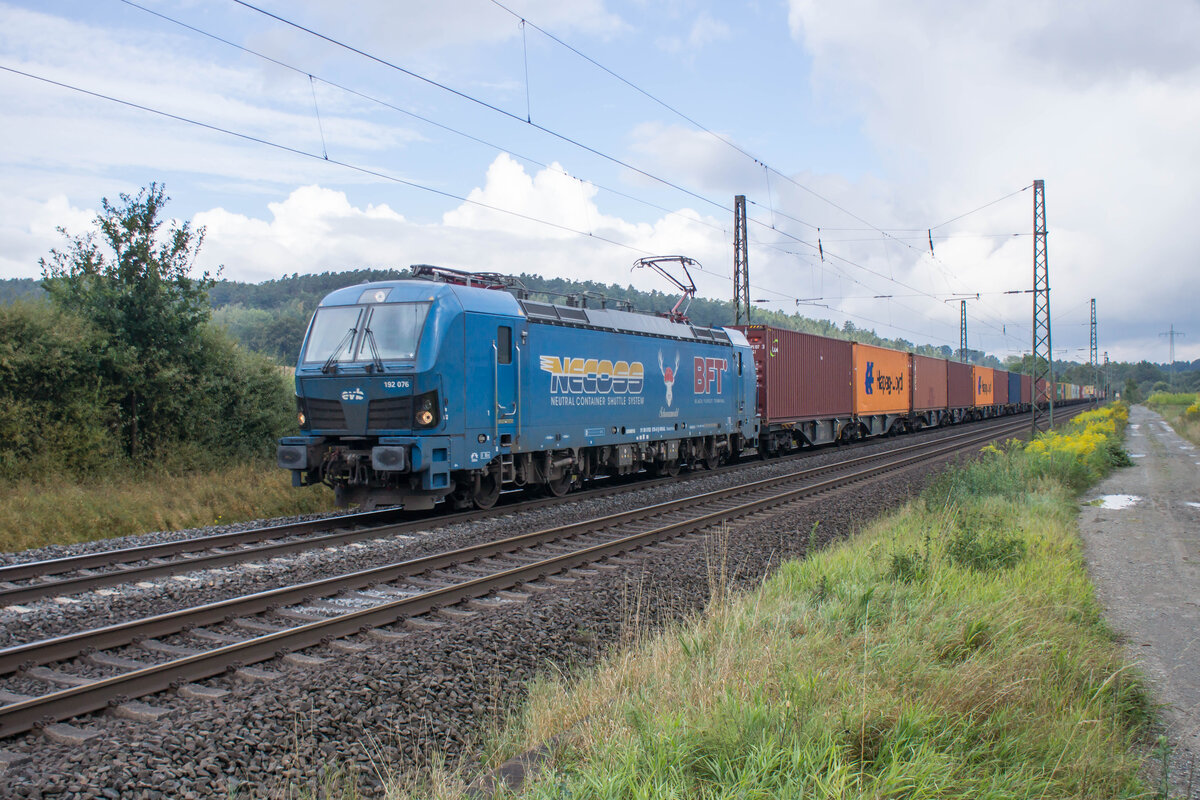 Der Smartron des EVU Northrail 192 076-8 mit dem "Schwarzwald-Hirsch" NECOSS (Neutal Container Shuttle System) BFT Black Forest Terminal am 20.04.2023 in Würzburg. Matthias Kümmel