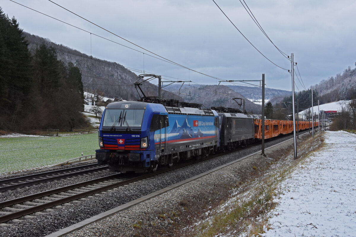 Doppeltraktion, mit den Loks 193 516-2 und 189 106-8 fährt Richtung Bahnhof Gelterkinden. Die Aufnahme stammt vom 01.02.2022.