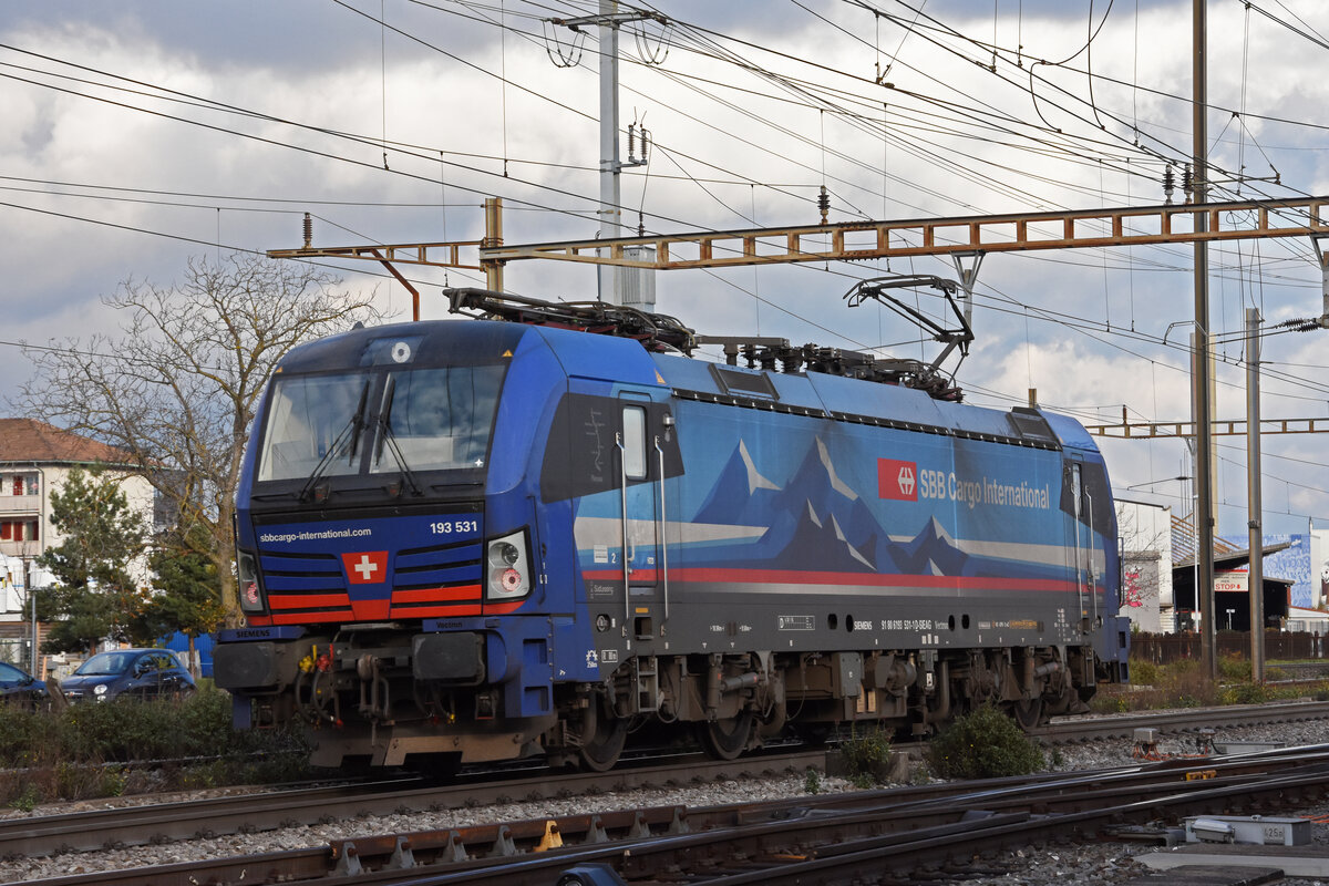 Doppeltraktion, mit den Siemens Vectron 193 531-1 und 193 528-7 durchfährt den Bahnhof Pratteln. Die Aufnahme stammt vom 13.12.2021.