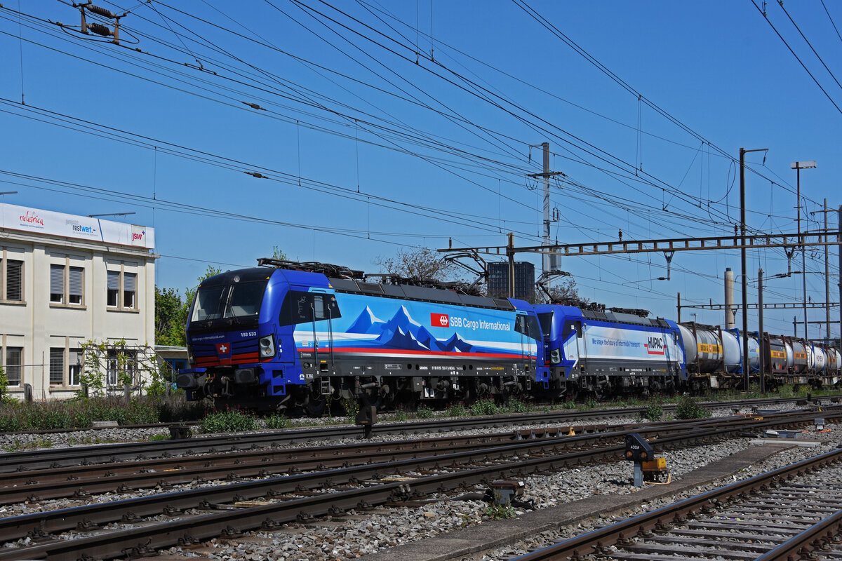 Doppeltraktion, mit den Siemens Vectron 193 533-7 und 193 490-0 durchfährt den Bahnhof Pratteln. Die Aufnahme stammt vom 27.04.2022.
