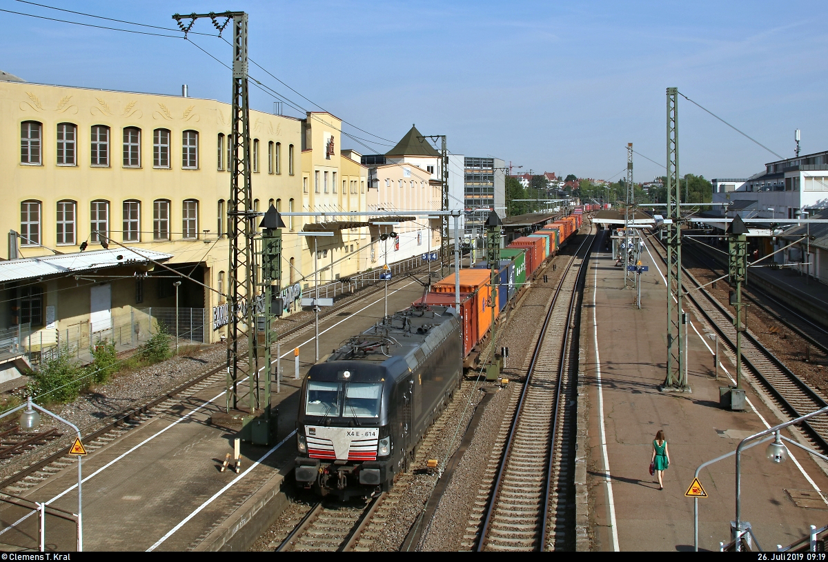 Containerzug mit 193 614-5 der Mitsui Rail Capital Europe GmbH (MRCE), vermietet an die boxXpress.de GmbH, durchfährt den Bahnhof Ludwigsburg auf Gleis 4 Richtung Kornwestheim. Aufgenommen von der Fußgängerbrücke. [26.7.2019 | 9:19 Uhr]