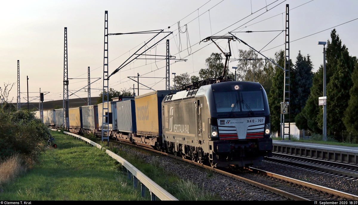 KLV-Zug mit 193 707-7 (X4 E - 707 | Siemens Vectron) durchfährt den Hp Zscherben auf Gleis 2 Richtung Halle Rosengarten. Aufgenommen im Gegenlicht. 🧰 Mitsui Rail Capital Europe GmbH (MRCE), vermietet an Mercitalia Rail S.r.l. 🚩 Bahnstrecke Halle–Hann. Münden (KBS 590) 🕓 17.9.2020 | 18:37 Uhr