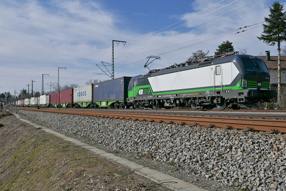 Vom Terminal Wolfurt kommend hat 193 765-5 der ELL mit einem Containerzug am 22.02.2021 in Hergatz von der bayerischen auf die württembergische Allgäubahn gewechselt und befindet sich auf der Fahrt in Richtung Memmingen. Jürgen Vos