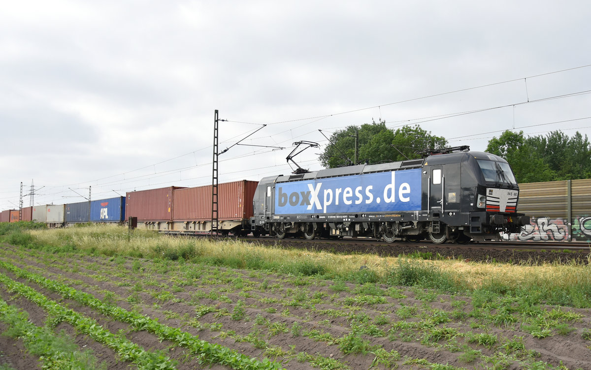BoxXpress mit der wunderbar sauberen 193 863-8 Vectron, kommend aus Richtung Lüneburg mit Container im Schlepp. Höhe Bardowick, 05.06.2018. Stefan Bree