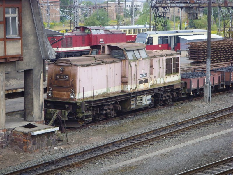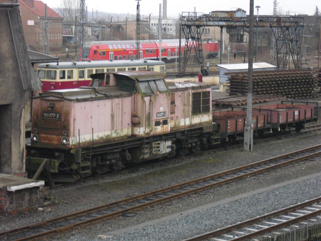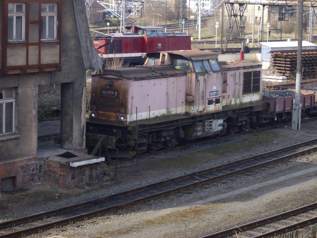 Vor 187 011-2 "Fischstäbchen" steht 199 877-2 (DR V 100) der Harzer Schmalspurbahnen GmbH (HSB) mit zwei Güterwagen im Bahnhof Nordhausen Nord.