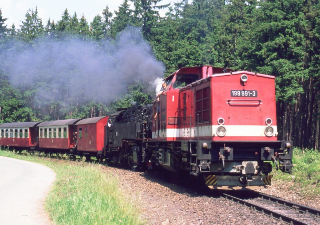 199 891-3 als Vorspann für eine 99.72 bei Sorge im Juli 1991, Dampflokfans waren wenig begeistert ...