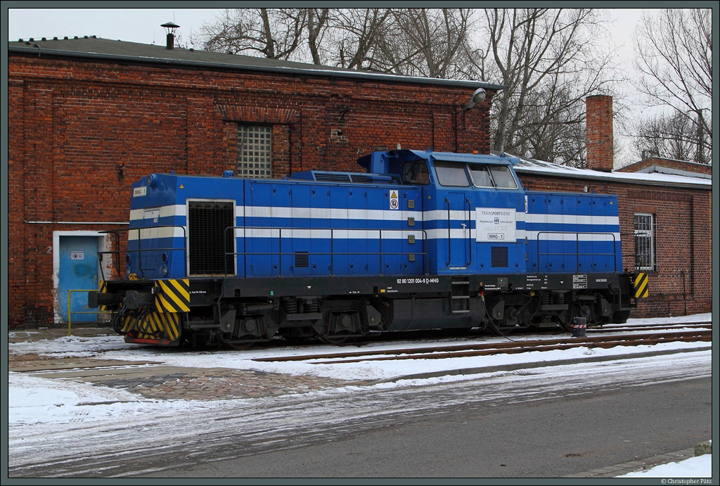 Die Lok 1 (ex 201 004-9) der Magdeburg Hafen GmbH steht am 20.01.2013 an der Lokwerkstatt am alten Handelshafen in Magdeburg.