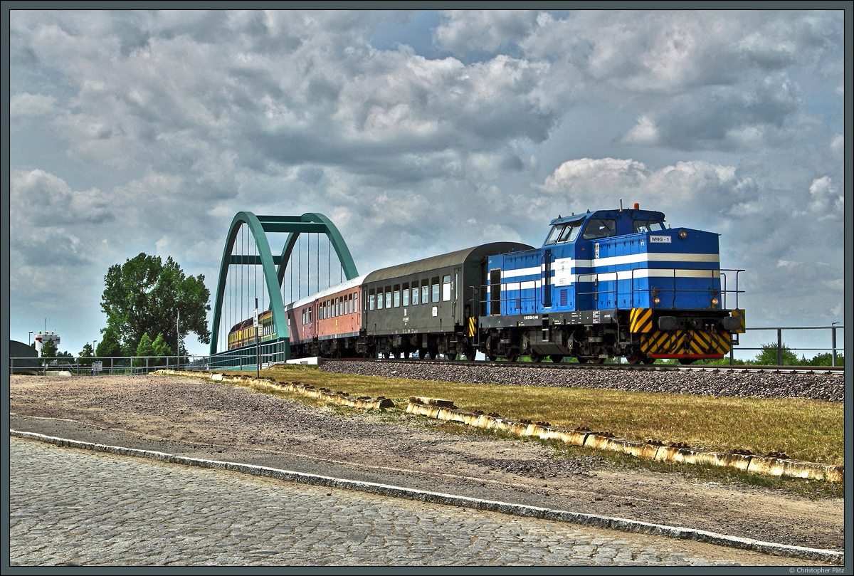 Lok 1 der Magdeburger Hafenbahn (ex 201 004-9) überquert am 21.05.2016 mit einem Sonderzug zur Niedrigwasserschleuse die Brücke zur Steinkopfinsel im Magdeburger Hafen.