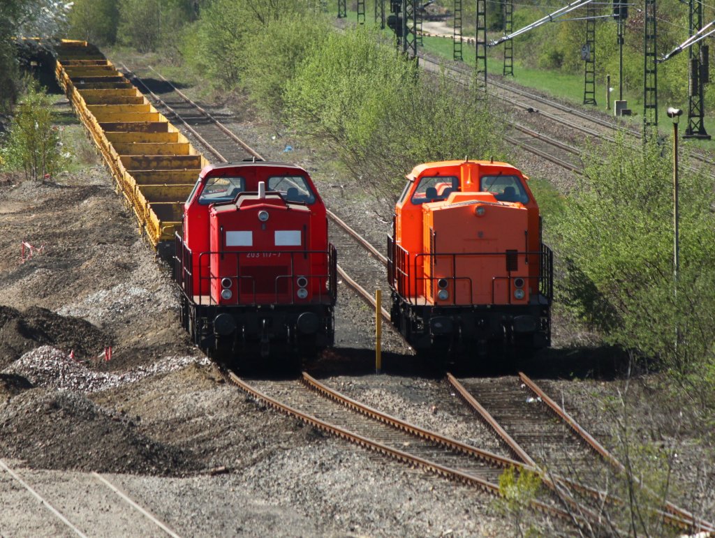 203 117-7 von BBL wartet am 02.04.2011 mit einem Bauzug in Stolberg, auf der Hauptstrecke rechts (Kbs 480) hämmert ein Thalys von Aachen kommend Richtung Köln vorbei. Mario Schürholz