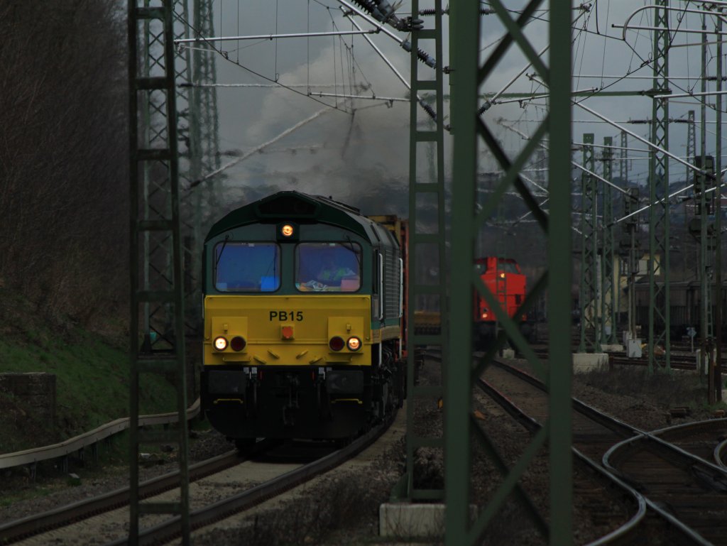 Durch einen Wald aus Masten hämmert PB15 auf der KBS 480 mit einem Containerzug am Haken auf den Bahnhof Stolberg zu. Rechts hinter dem Mast steht 203 117-7 von BBL mit einem Bauzug.