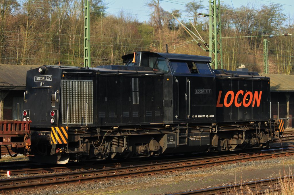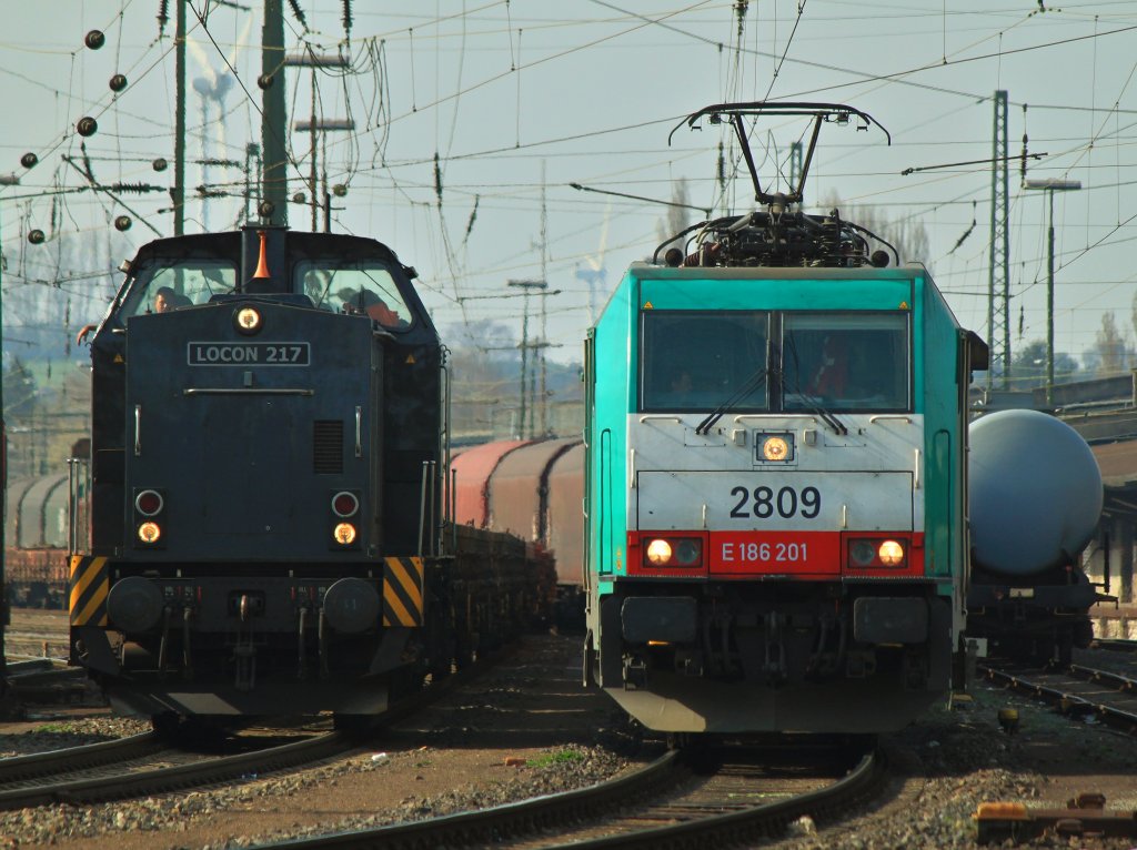Locon 217 (203 123-5) steht am 27.03.2012 mit einem mit alten Gleisschotter beladenen Niederbordwagenzug neben Cobra 186 201 (2809), die einen Coil-Zug aus Belgien am Haken hat in Aachen West. Beide Züge warten auf Abfahrt Richtung Köln.
