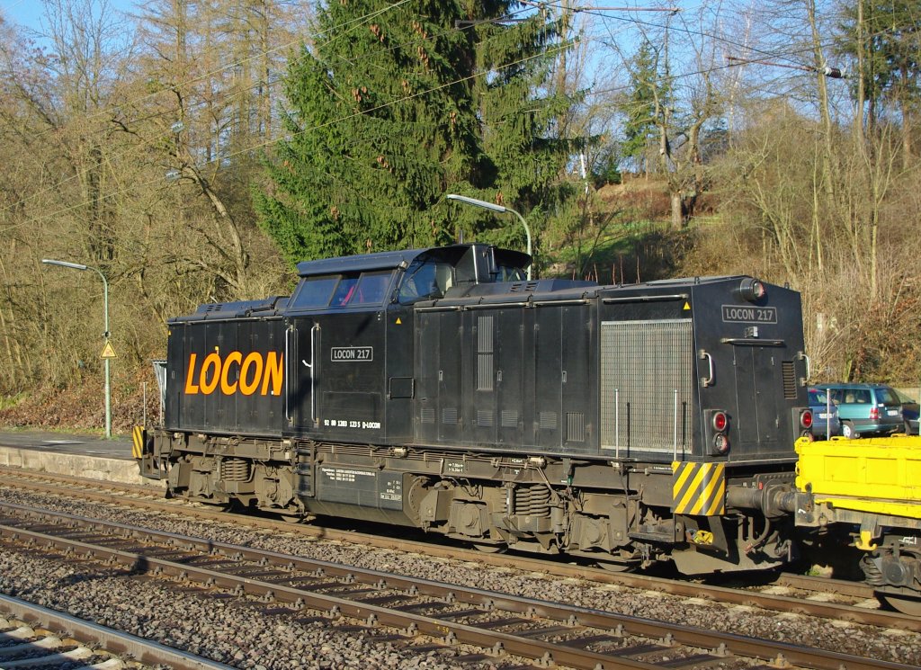 LOCON 217 (203 123-5) ex DR 110 376-1 der LOCON LOGISTIK & CONSULTING AKTIENGESELLSCHAFT mit einem Bauzug in Rathenow Richtung Stendal unterwegs. 24.11.2011