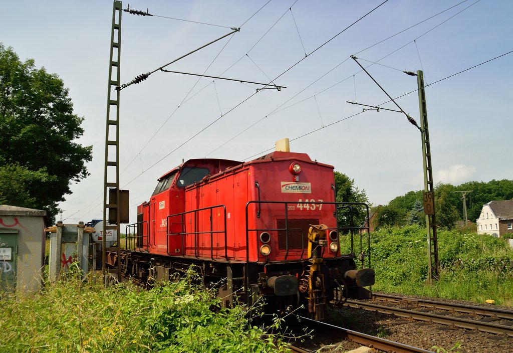 Aus Richtung Osterath kommend ist die 203 443-7 von Chemion mit einem Zug in Richtung Neuss fahrend hier kurz vor einem Bahnübergang bei Broicherseite. 1.7.2013