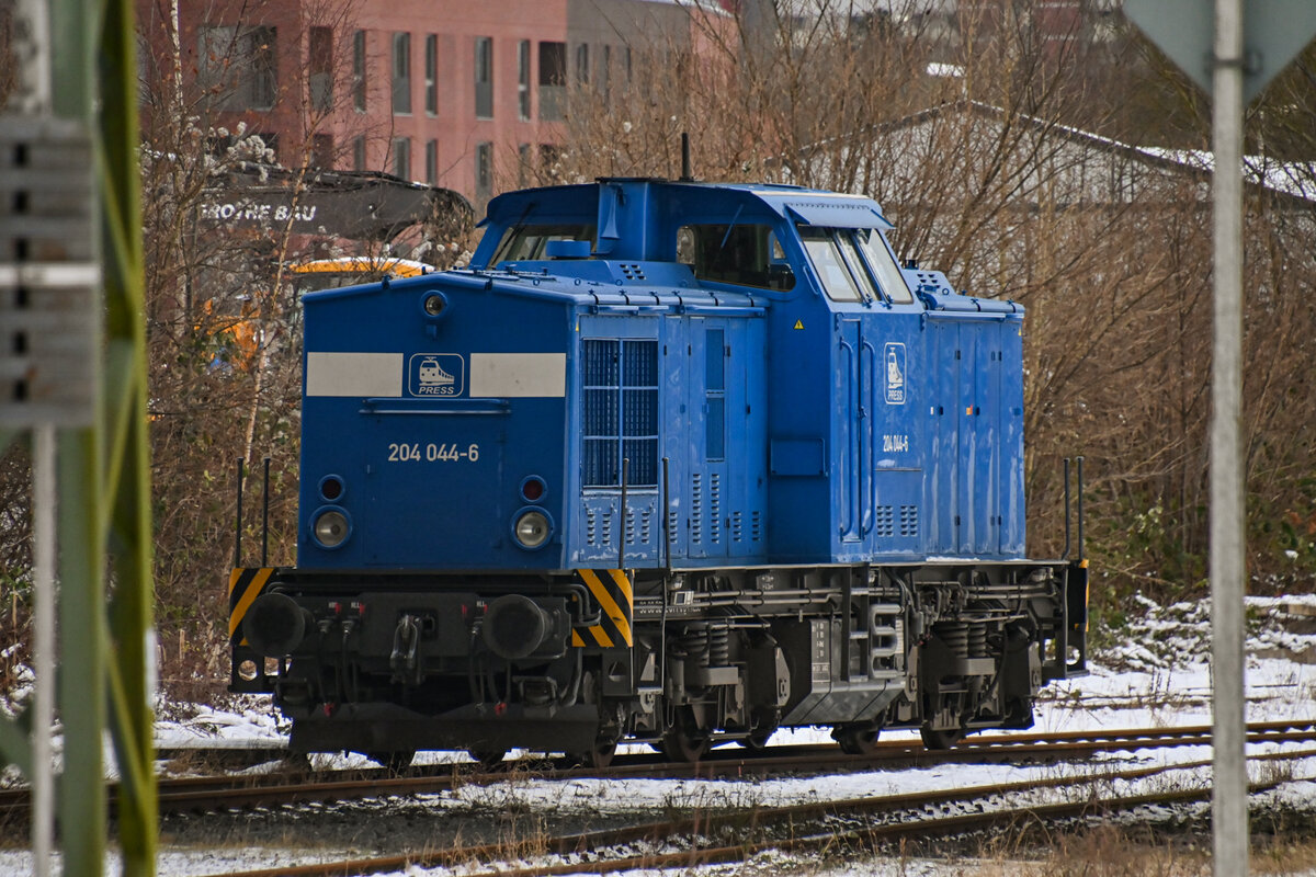 204 044-6 der Eisenbahn-Bau- und Betriebsgesellschaft Pressnitztalbahn (PRESS) als Tfzf fährt an der Angersdorfer Straße in Zscherben auf der Bahnstrecke Halle–Hann. Münden (KBS 590) vorbei. [11.4.2017 - 18:53 Uhr] Clemens Kral