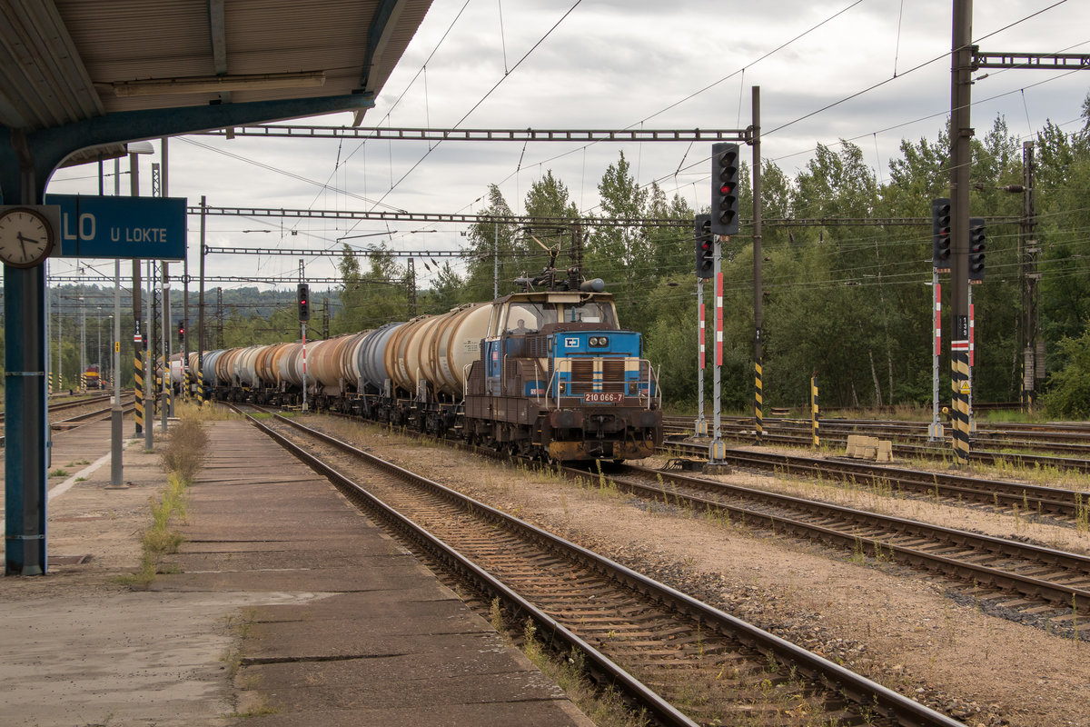 Bahnhof Nove Sedlo u Lokte am 4. August 2017. Die Rangier E-Lok 210 066-7 steht abgebügelt vor einem Kesselzug.
