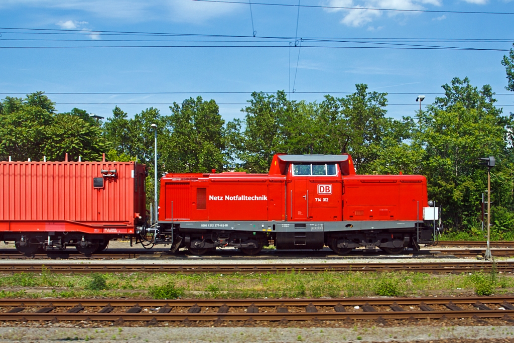 Die 714 012 (ex DB 212 277-8, ex DB V 100 2277) der DB Netz Notfalltechnik, als eine der beiden Lokomotiven des in Mannheim stationierten Tunnelrettungszuges auch Tunnelhilfszug (TuHi), hier am 29.05.2012 beim Hbf Mannheim, aufgenommen aus einem einfahrendem ICE. Die V 100.20 wurde 1965 bei MaK in Kiel unter der Fabriknummer 1000324 gebaut und als V 100 2277 an die DB ausgeliefert. Umzeichnung in 212 277-8 erfolgte 1968, der Umbau zur Rettungszuglok und die Umzeichnung in 214 277-6 erfolgte 1990, Umzeichnung in 714 277-1 erfolgte 1994 und in 714 012-2 1996. Sie trägt die NVR-Nummer 92 80 1212 277-8 D-DB.