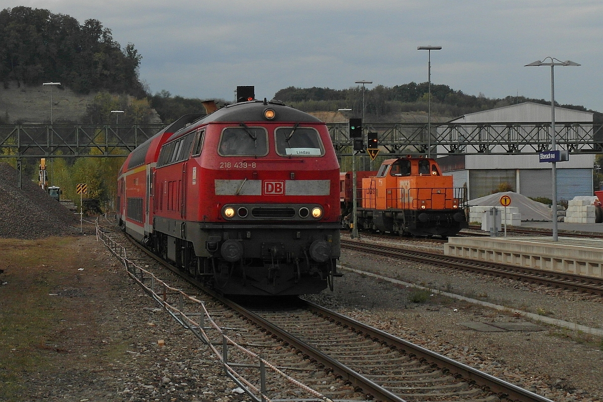 218 439-8 mit dem IRE 81311, Ulm - Biberach (Riß) begegnet bei der Einfahrt in den Zielbahnhof der auf Rangierfahrt befindlichen 214 024-2 von BBL Logistik. Auf Grund einer baustellenbedingten Streckensperrung zwischen Biberach (Riß) und Aulendorf endete die Fahrt am 11.10.2016 nicht wie auf der Zugzielanzeige aufgeführt in Lindau sondern vorzeitig in Biberach (Riß).