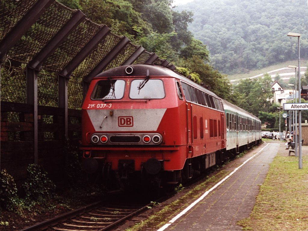 215 037-3 mit RB 22540 Remagen-Kreuzberg auf Bahnhof Altenahr am 22-7-2000. Bild und scan: Date Jan de Vries.