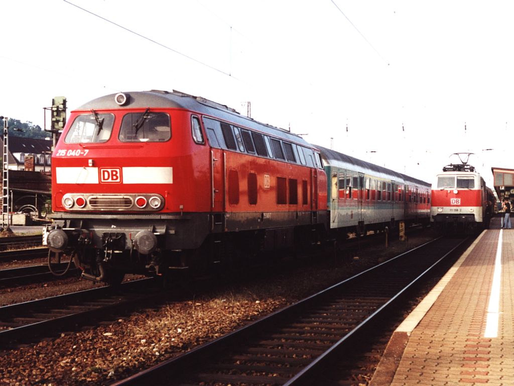 Drei Lackierungen der Br 215:. Die 215 040-7 mit RB 22372 Trier-Wasserbillig auf Trier Hauptbahnhof am 21-7-2000. Bild und scan: Date Jan de Vries.