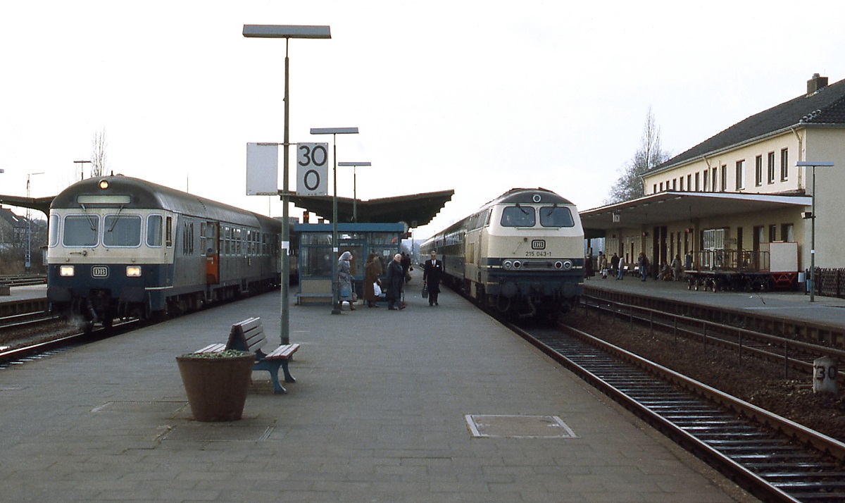 Der Bahnhof Euskirchen Ende der 1980er Jahre und am 04.07.2020: Auf der oberen Aufnahme repräsentieren nicht nur die beige-türkise 215 043-1 und der Karlsruher Steuerwagen, sondern auch die Bahnhofsgestaltung die klassische Epoche IV, während er sich auf dem unteren Bild im modernen Outfit der Epoche VI zeigt. Dazu passt der 620 010, der Euskirchen in Richtung Meckenheim verlässt. Horst Lüdicke