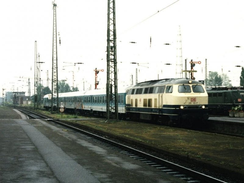 Mitte der 1990er Jahre stehen 215 115-7 und 110 486-4 abfahrbereit im Krefelder Haupbahnhof